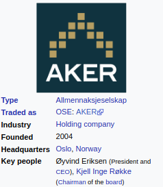 Aker ASA (OSL AKER) is a Norwegian holding company engaged within offshore, fishing, construction and engineering. The company is listed on Oslo Stock Exchange and is controlled by Kjell Inge Røkke with 66.66% ownership through TRG Holding. The corporate headquarters are located in Oslo, Norway.