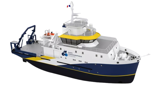 The French-flagged vessel measures 45.00 meters in overall length with a beam of 11.50 meters. It is primarily designed for coastal research missions in mainland French waters, including the Bay of Biscay and the Channel, but also holds the capability for deployments in certain years along the coast of Africa, the Antilles, and the French West Indies-Guyana zone. It will accommodate a crew of 12 and a complement of 10 scientists.